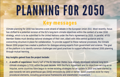 This briefing summarizes the insights collected throughout the activities of Climate Recon 2050 project. The Climate Recon 2050 platform offers a dialogue among experts from government and science. It provides insights into the key elements of already existing long-term strategies and dives into practical examples, collaboration opportunities and challenges by Member States. The information available supports policy-makers in the design of the long-term strategies yet also informs a wider stakeholder group on what elements are essential for a Paris compatible long-term strategy. Climate Recon 2050 project is financed by the European Climate Initiative (EUKI), established in 2017 by the German Environment Ministry to foster intra-EU exchange on climate policy at all levels of society and policy-making.